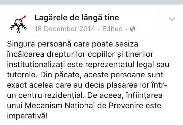 Folosind imagini grafice si cifre brute care denota dimensiunea fenomenului violentei institutionalizate impotriva persoanelor cu dizabilitati din locuri inchise, campania Lagarele dintre noi a starnit, pe buna dreptate, indignarea multor cetateni. CRJ a deturnat energia creata in urma acestei campanii catre petitia adresata Parlamentului pentru adoptarea proiectului de lege. Daca nimeni nu contesta gravitatea problemei descrise, nu rezulta de nicaieri ca mecanismul este solutia optima. Campania “Lagarele dintre noi” a supraestimat in mod constant capacitatea acestui mecanism de a rezolva problemele majore din sistemul institutional, inducandu-si astfel in eroare suporterii si publicul. Unul din sloganele campaniei “Semneaza petitia si elibereaza-i din lagare” este un exemplu elocvent in acest sens, avand in vedere lipsa completa de realism a acestei viziuni. Alte mesaje alese la intamplare contin fracturi logice evidente, portretizand mecanismul ca un panaceu la toate problemele pe care le intampina nefericitii din institutii: